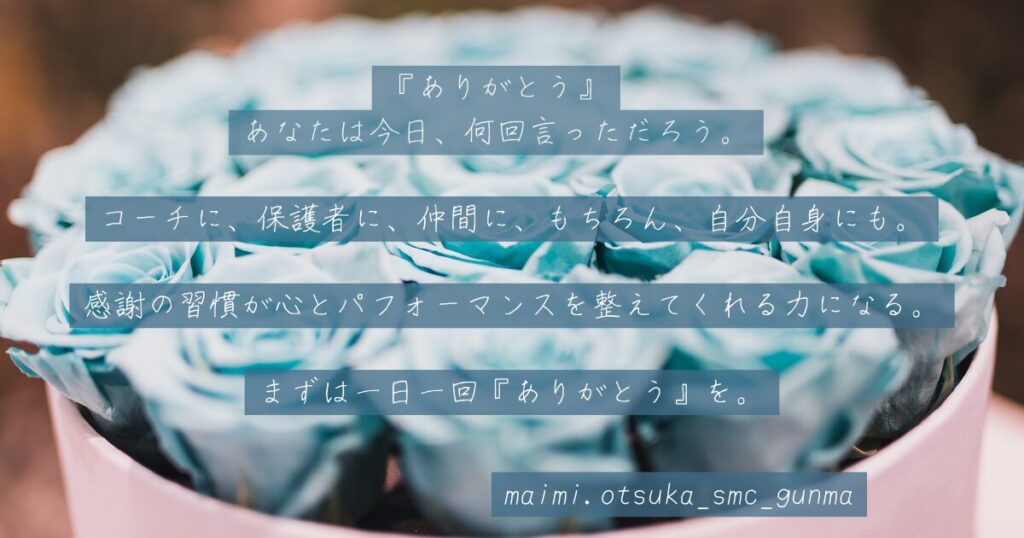 『ありがとう』という言葉をあなたは今日、何回言いましたか? 保護者に仲間に、コーチにスタッフに、そして自分自身にも。練習道具や練習場所へも言えていたでしょうか? 私は寝る前、一日を振り返って今日あった小さな感謝を一つ考えてから眠りにつくこ... -